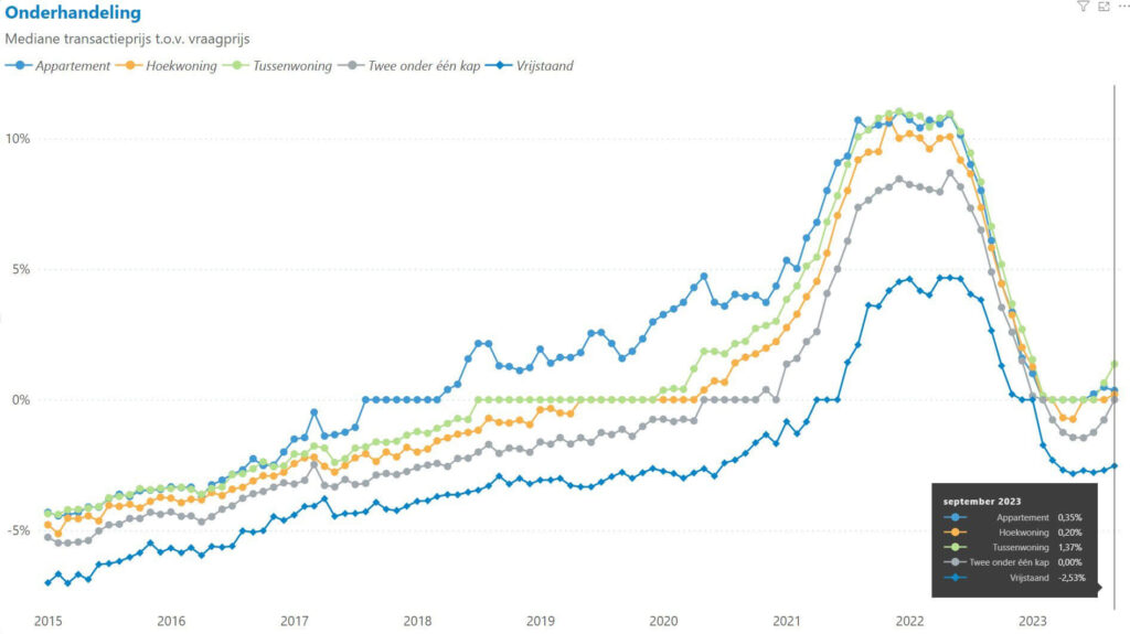 Sinds 2015 werd er voor alle woningtypen steeds minder onder de vraagprijs geboden, en in december 2021 bereikten de overbiedingen hun hoogtepunt. Maar deze trend was even volledig omgekeerd. Afgelopen februari werd er zelfs gemiddeld niet meer overboden op geen enkel woningtype. Echter, deze omslag lijkt nu weer verleden tijd te zijn, aangezien de mediane transactieprijzen momenteel iets boven de vraagprijzen liggen voor rijwoningen en appartementen.