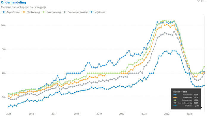 Sinds 2015 werd er voor alle woningtypen steeds minder onder de vraagprijs geboden, en in december 2021 bereikten de overbiedingen hun hoogtepunt. Maar deze trend was even volledig omgekeerd. Afgelopen februari werd er zelfs gemiddeld niet meer overboden op geen enkel woningtype. Echter, deze omslag lijkt nu weer verleden tijd te zijn, aangezien de mediane transactieprijzen momenteel iets boven de vraagprijzen liggen voor rijwoningen en appartementen.